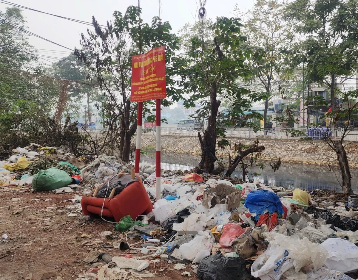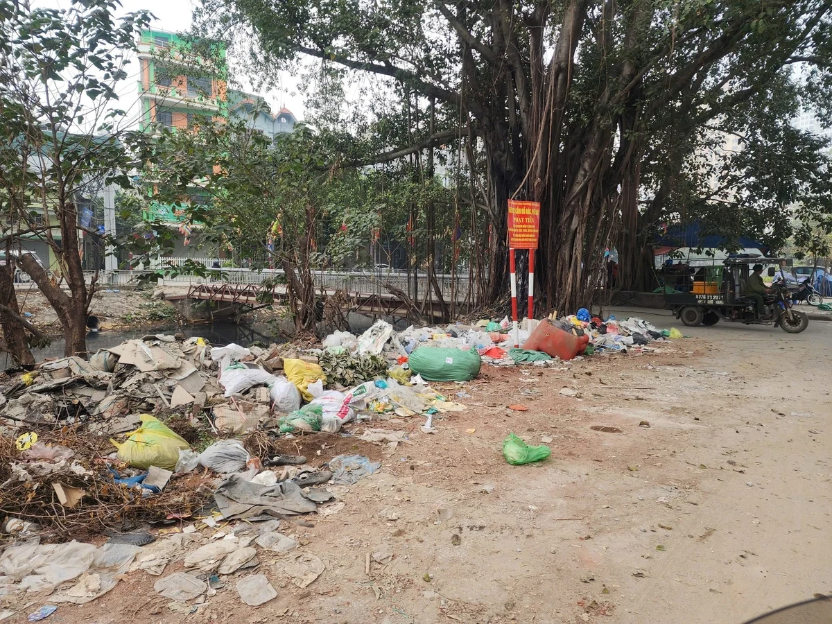 Khu vực Phường Định Công là một trong những ví dụ điển hình. Tại một số điểm ven bờ sông Tô Lịch, bãi đất trống và khu vực giáp đường lớn, rác thải chất thành đống kéo dài nhiều tháng. Điều đáng nói là ngay giữa những đống rác ấy, biển “Cấm đổ rác” được dựng cao, chữ đỏ nổi bật, ghi rõ mức phạt và căn cứ xử lý. Thế nhưng, biển cấm dường như chỉ mang tính hình thức. Rác vẫn tiếp tục được tập kết ngày một nhiều hơn.